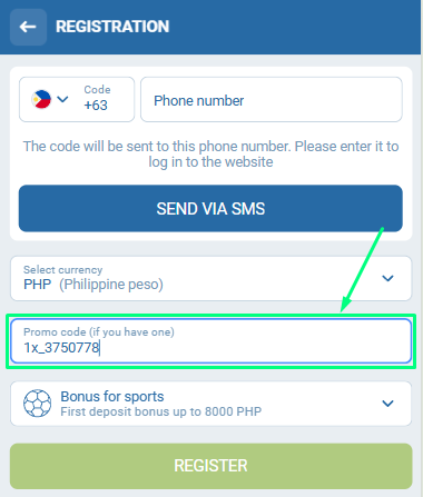 - Enter the promo code 1x_3750778 in the ‘Promo Code’ field during registration.